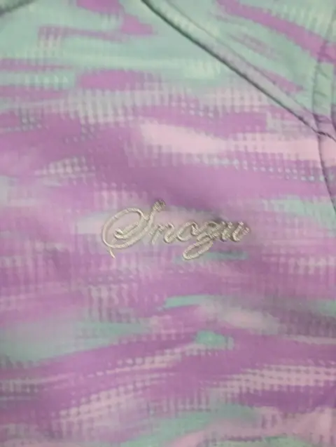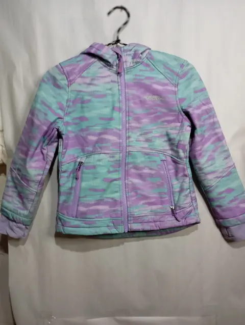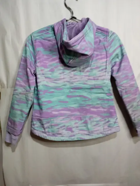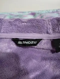 Bonita, practica y cómoda chamarrita en tonalidades verde agua y púrpura marca Snozu para niñas de 7-8 años, está en perfecto estado.