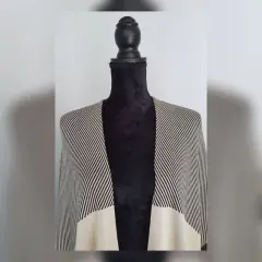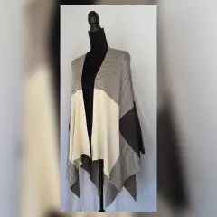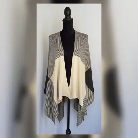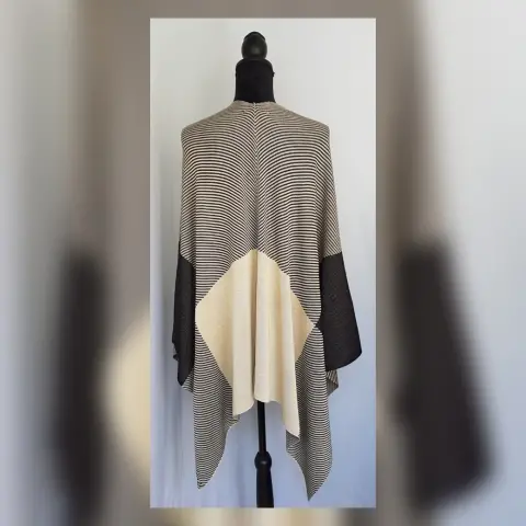 Capa ensamble en tejido de punto bitono BEIGE/NEGRO, cuello pico y sin sistema de cierre. UNITALLA (Da a S/M/L/XL). Dimensiones cms: 140 largo, 109 largo. 100% viscosa. Para lavado en casa.