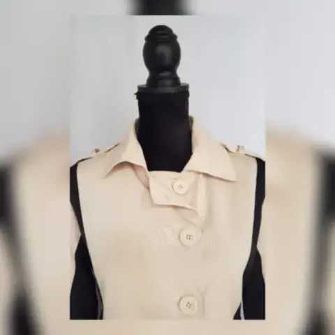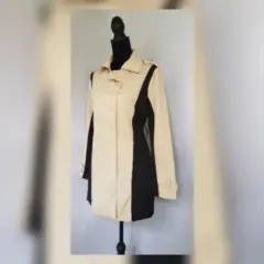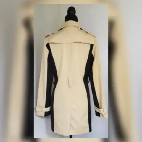 Gabardina ligera bitono CAPUCHINO/NEGRO, cuello clásico c/solapas, charreteras en hombros cierre p/botonadura, 2 bolsos vivo frontales, trabillas en cintura, manga larga terminada en tira c/botón y forro fantasía interior. Talla CH (AMPLIA, da mejor a M). Dimens cms: 41 hombro, 52 axila, 46 cintura, 58 zona baja, 80 largo, 62 largo manga. 88% poliéster, 9% viscosa, 3% elastano. P/lav en seco.***NO ES IMPERMEABLE***NO CUENTA CON CINTURÓN, ASÍ LA COMPRÉ***