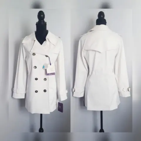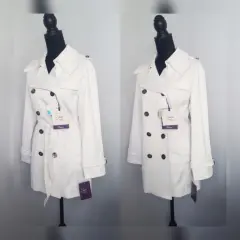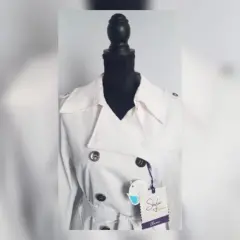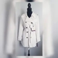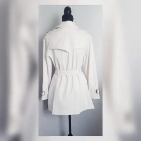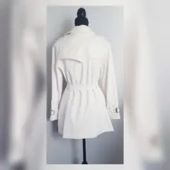 Gabardina Lightwear Impermeable BLANCO. Gabardina lightwear (water resistant/breathable) tono BLANCO POLAR, cuello clásico c/solapa muesca, charreteras en hombros c/botonadura, cierre p/botonadura doble, 2 bolsos laterales vivo c/solapa, 1/2 solapa antitormenta delantera, solapa antitormenta trasera, manga larga terminada en tiras c/hebilla, cinturón mismo tejido p/mejor ajuste y forro interior. Talla M. Dimensiones cms: 47 hombro, 52 axila, 48 cintura, 59 zona baja, 76 largo, 59 largo manga. 60% poliéster, 37% algodón, 3% elastano. Para lavado en seco.***Prenda tratada con nanotecnología que le permite soportar lluvias de ligeras a medias y ser totalmente transpirable y ligera.***