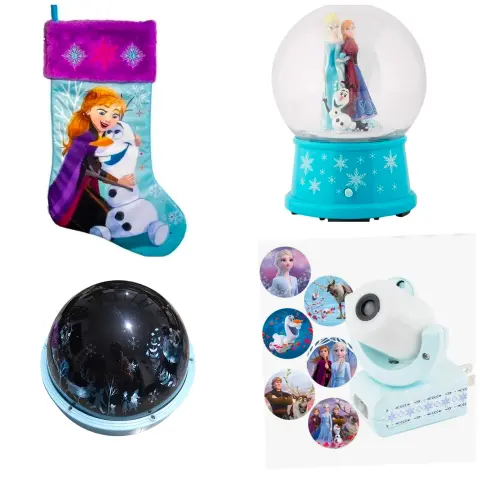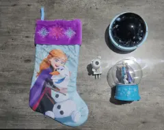 Decoración Navideña Disney Frozen.Son 4 productos funcionando al 100%, no se usaron mucho, no tienen detalles.Casi cómo nuevos! 1 bota de tela1 esfera de nieve1 proyector grande1 proyector chico con enchufe.