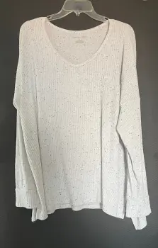 American Eagle camiseta/blusa gris claro con puntos en azul y negro tipo jaspeado y mini canaleta vertical. Larga oversize de cuello semi redondo y manga larga. Ideal para look casual en días frescos.Talla: XGColor: gris claroMaterial: 48% viscosa, 47% poliéster y 5% elastanoCuidado: lavar en máquina Medidas: ancho de sisa a sisa: 74 cm, largo desde hombro hasta abajo: 62 cm