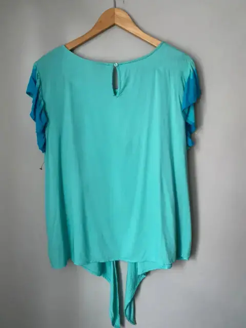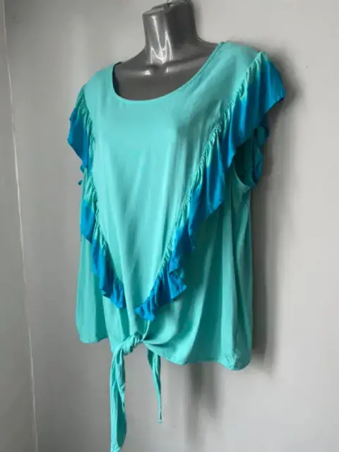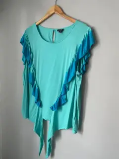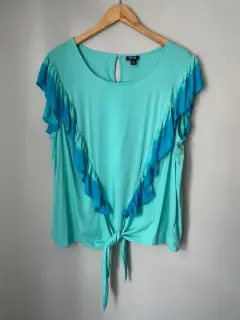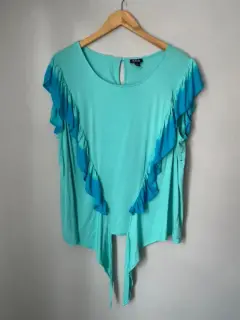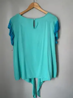 Blusa Aqua con olanes. Bonita blusa color Aqua, se ajusta de la cintura con el nudo. La tela es ligera Medidas aproximadas De axila a axila 61 cm Largo 65 cm