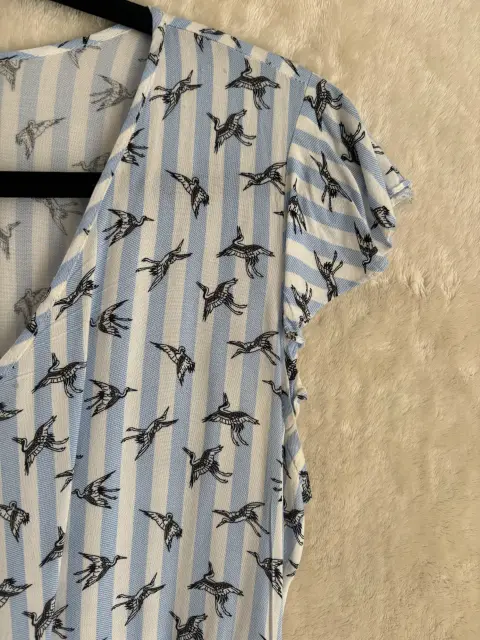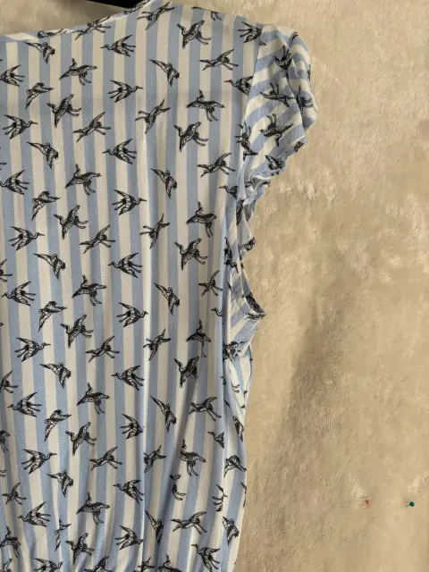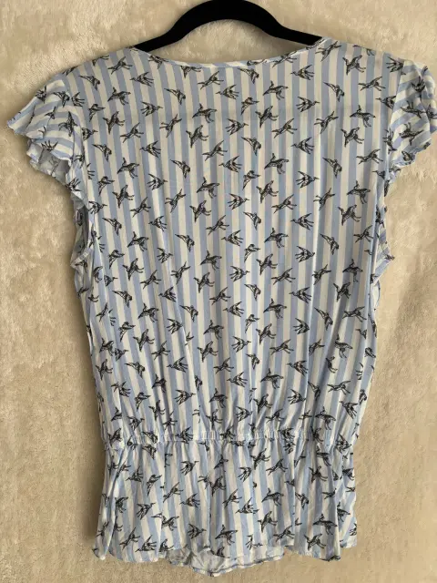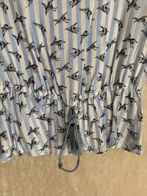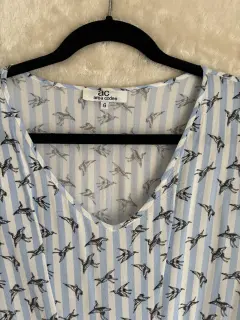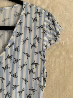 Color azul cielo con rayas blancas Talla GMaterial Algodón y poliesterDescripciónBlusa corte slim, mangas cortas, color base azul con rayas blancas con figuras de ave color negras, cuello en V , resorte abajo de la cintura con aplicación de listón tipo cuerda, Estado Usado una vez Precio 400Medidas en centímetros Ancho hombros 36 cmCuello 24 cm Escote corto19 cmBusto 50 cmLargo 61 cm Mangas cortas11 cm