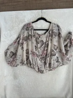 Color beige Talla MMaterial nylonDescripciónCi Blusa holgada, mangas largas tipo vampiro color base beige rosa y verde, figuras florales, cuello ojal, resorte al final de la blusa y de las mangas, avertura en la espalda que se disimulaEstado Usado una vez Precio 400Medidas en centímetros Ancho hombros no se marcan los hombros Cuelo 41 cm Busto 65 cmLargo 55 cm Largo mangas 51 cm resorte al final Resorte en la mangas 5 cm de largo