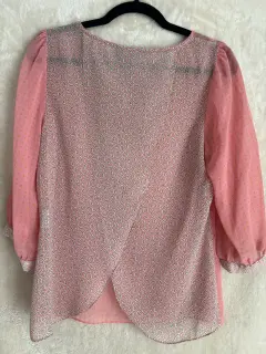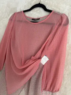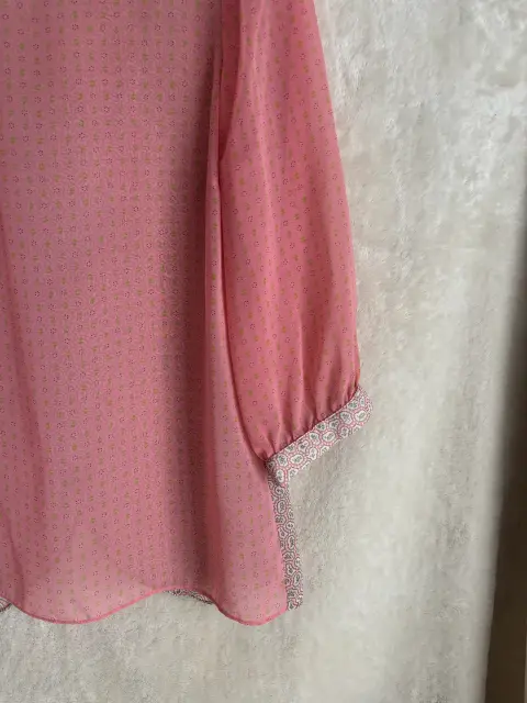 Color Rosa Talla 9Material POLIESTERDescripciónBlusa holgada, mangas largas 3/4 con puño al final, color base rosa con figuras conminación de coles en las figuras verde y blanco, cuello redondo, corte holgándo, apertura en la espalda simulada terminación redonda Estado Usado una vez Precio 400Medidas en centímetros Ancho hombros 36 cmCuello 24 cm Escote corto10 cmBusto 50 cmLargo 623 cm Largo mangas 48 cm puñoal final