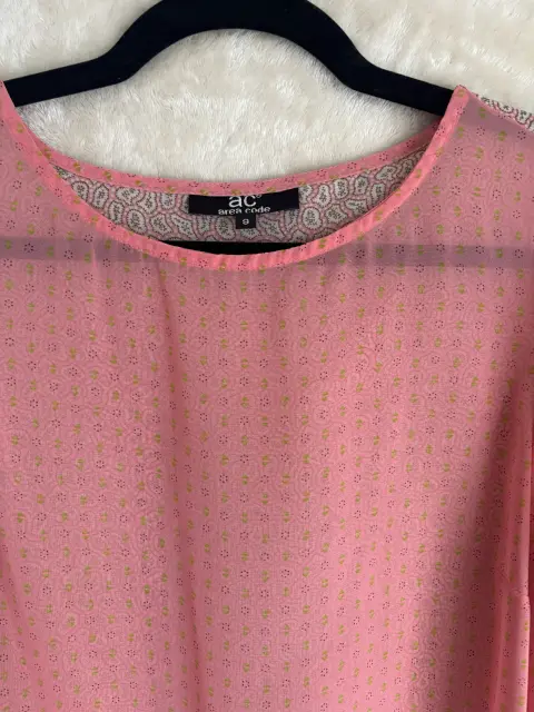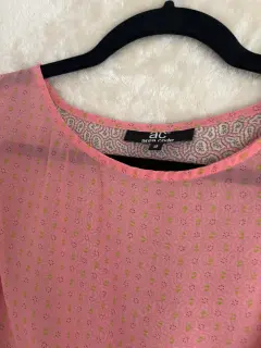 Blusa Area Code Rosa magas tres cuartos. Color Rosa Talla 9Material POLIESTERDescripciónBlusa holgada, mangas largas 3/4 con puño al final, color base rosa con figuras conminación de coles en las figuras verde y blanco, cuello redondo, corte holgándo, apertura en la espalda simulada terminación redonda Estado Usado una vez Precio 400Medidas en centímetros Ancho hombros 36 cmCuello 24 cm Escote corto10 cmBusto 50 cmLargo 623 cm Largo mangas 48 cm puñoal final