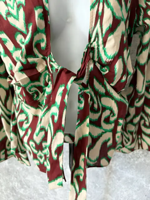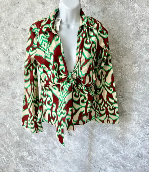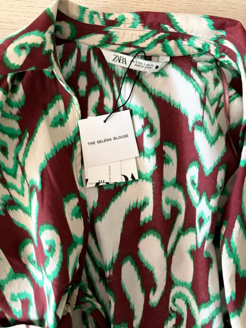 Blusa estructurada boho chic Zara tipo Front Tie (nudo al frente), modelo The Selena Blouse”, manga larga con cuello clásico y estampado étnico en tonos marrón vino, verde esmeralda y beige, diseño de lazo frontal ajustable que permite anudarla al centro para un toque femenino y moderno. Confeccionada en tejido ligero y fluido, ideal para looks frescos y versátiles.