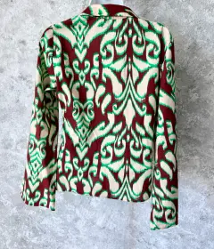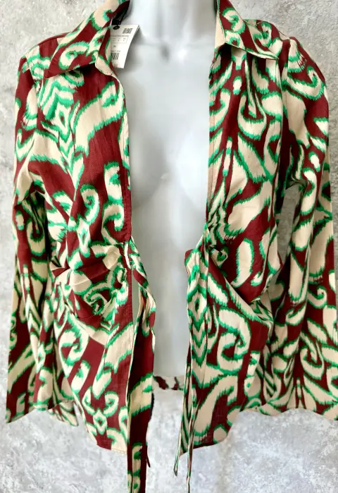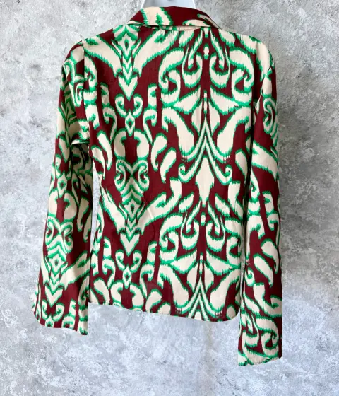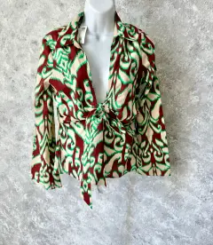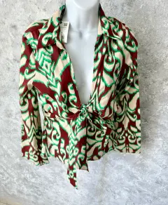 Blusa boho chic tipo Front Tie Zara. Blusa estructurada boho chic Zara tipo Front Tie (nudo al frente), modelo The Selena Blouse”, manga larga con cuello clásico y estampado étnico en tonos marrón vino, verde esmeralda y beige, diseño de lazo frontal ajustable que permite anudarla al centro para un toque femenino y moderno. Confeccionada en tejido ligero y fluido, ideal para looks frescos y versátiles.