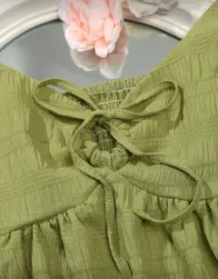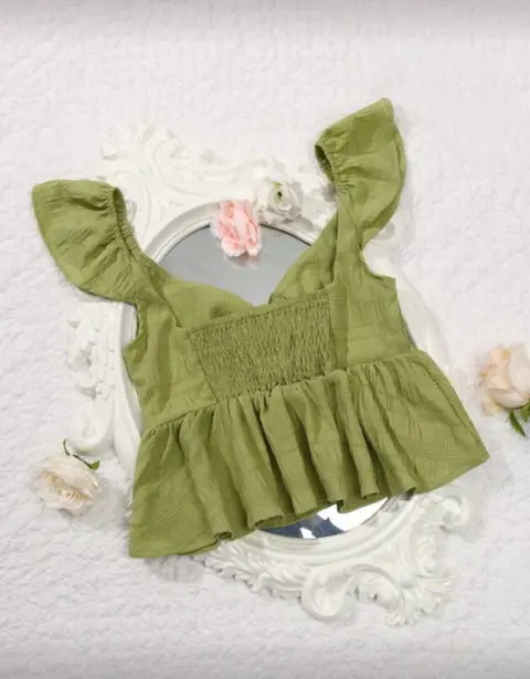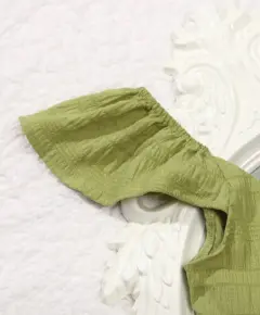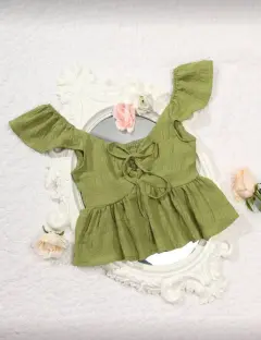 Blusa de verano, con hombros descubiertos y volantes, detalle de listón en el centro de la blusa