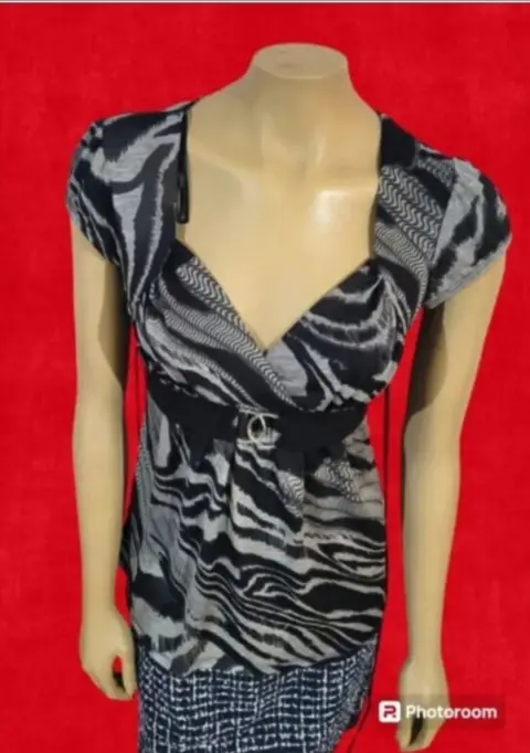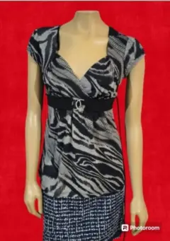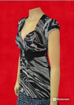 Blusa Casual IZ Bayer California, talla mediana, color negro con gris, acentos de pcinto con arose metalicos plateadas en el cintura, cuello en V, con manga corta, cintura acentada, slip on, hecha de mescla de poliéster y algodón, mide 28cm de hombro a hombro, 42cm de axila a axila, 45cm de cintura con 68cm de largo del hombro hacia abajo, previamente usada en buen estado.