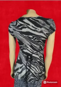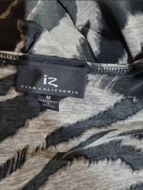 Blusa Casual IZ Bayer California. Blusa Casual IZ Bayer California, talla mediana, color negro con gris, acentos de pcinto con arose metalicos plateadas en el cintura, cuello en V, con manga corta, cintura acentada, slip on, hecha de mescla de poliéster y algodón, mide 28cm de hombro a hombro, 42cm de axila a axila, 45cm de cintura con 68cm de largo del hombro hacia abajo, previamente usada en buen estado.