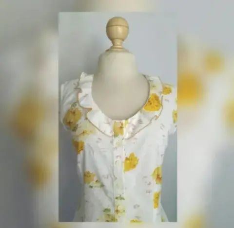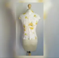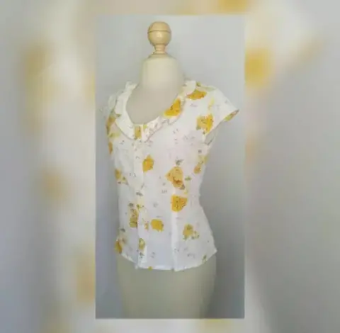 Blusa BLANCA manga corta con diseño de flores en tonos AMARILLO/VERDE/CAFÉS, cuello redondo con escarola, cierre mediante botonadura, 100% poliéster, talla 11 (MUY REDUCIDA, da mejor a talla 7/9). Dimensiones: 38 cms hombro a hombro, 46.5 cms axila a axila, 43 cms cintura, 53.5 cms zona baja, 51 cms largo, 8.5 cms largo manga. Para lavado en casa. SIN DETALLES, se uso solo una vez p/unas horas.***SE ENTREGA LAVADA Y DEODORIZADA***SIN DETALLES***