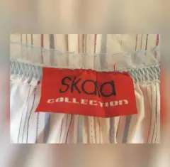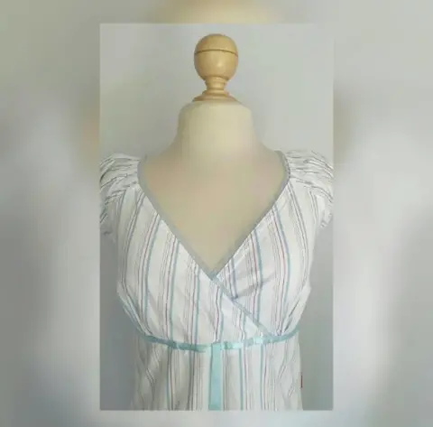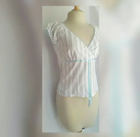 Blusa color BLANCO con líneas en tonos azules, gris, magenta e hilo plateado, con manga corta, escote V, con listón azul en zona frontal. Unitalla (reducida, da mejor a talla S/M). Dimensiones: 34 cms hombro a hombro, 43 cms axila a axila, 41.5 cms cintura, 47.5 cms zona baja, 47 cms largo. 90% poliéster, 10% algodón. Para lavado en casa. SIN DETALLES, se uso solo una vez por un par de horas.