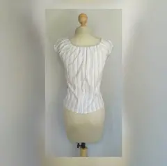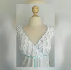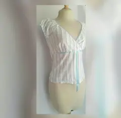 Blusa Casual Ligera Rayas. Blusa color BLANCO con líneas en tonos azules, gris, magenta e hilo plateado, con manga corta, escote V, con listón azul en zona frontal. Unitalla (reducida, da mejor a talla S/M). Dimensiones: 34 cms hombro a hombro, 43 cms axila a axila, 41.5 cms cintura, 47.5 cms zona baja, 47 cms largo. 90% poliéster, 10% algodón. Para lavado en casa. SIN DETALLES, se uso solo una vez por un par de horas.