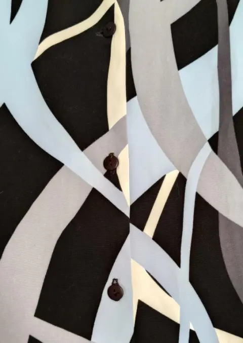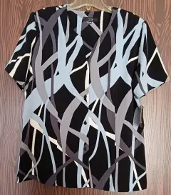 Blusa City negro/azul/gris y blanco XL. Blusa negra con diseño de trazos azules, gris y blanco. Manga corta. Con hombreras, botones al frente, y abertura de 5 cm a los lados. Marca: CITY. Talla: 36 o XL. Hecha en México con tela importada de Indonesia. Fabricada en poliéster 100%. Corte suelto, muy cómoda.Medidas: axila a axila: 58 CM. Hombro a hombro: 50 CM. Largo: 71 CM.