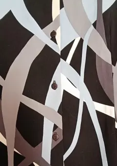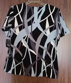 Blusa negra con diseño de trazos azules, gris y blanco. Manga corta. Con hombreras, botones al frente, y abertura de 5 cm a los lados. Marca: CITY. Talla: 36 o XL. Hecha en México con tela importada de Indonesia. Fabricada en poliéster 100%. Corte suelto, muy cómoda.Medidas: axila a axila: 58 CM. Hombro a hombro: 50 CM. Largo: 71 CM.