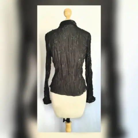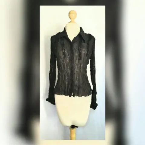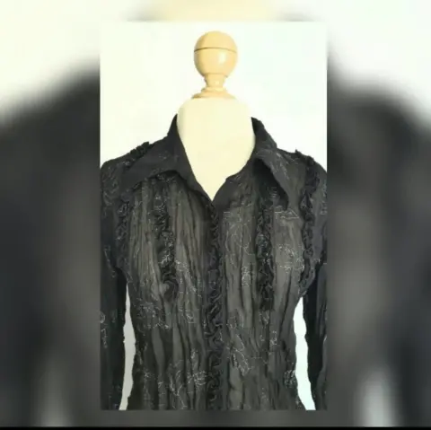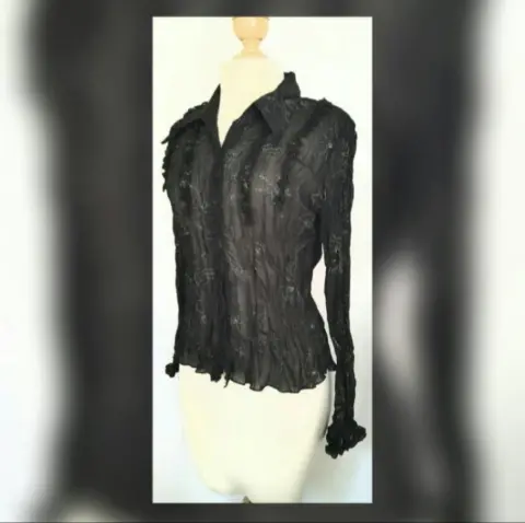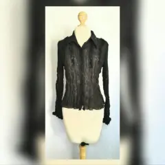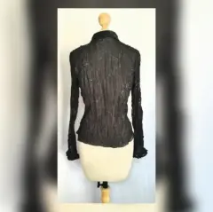 Blusa Corrugada con Escarolas. Blusa negra manga larga c/diseño de flores en hilo plateado, cuello clásico c/solapa, cierre mediante botonadura y mini escarolas en zona frontal y puños, talla 13 (MUY REDUCIDA, DA MEJOR A TALLA 9). Dimensiones cms: 38 hombro, 47 axila, 37.5 cintura, 48 zona baja, 57 largo, 66 largo manga. 100% poliéster. Para lavado en casa. SIN DETALLES, se uso solo una vez por un par de hrs.