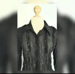 Blusa negra manga larga c/diseño de flores en hilo plateado, cuello clásico c/solapa, cierre mediante botonadura y mini escarolas en zona frontal y puños, talla 13 (MUY REDUCIDA, DA MEJOR A TALLA 9). Dimensiones cms: 38 hombro, 47 axila, 37.5 cintura, 48 zona baja, 57 largo, 66 largo manga. 100% poliéster. Para lavado en casa. SIN DETALLES, se uso solo una vez por un par de hrs.