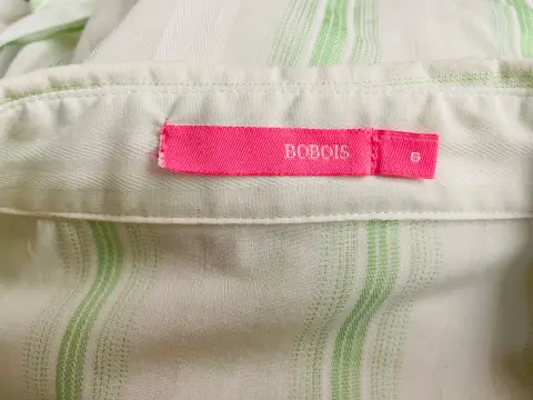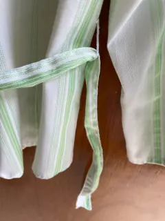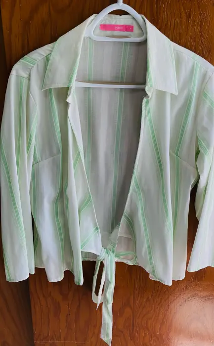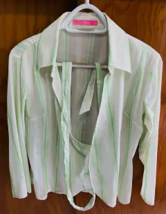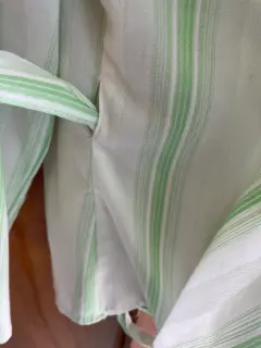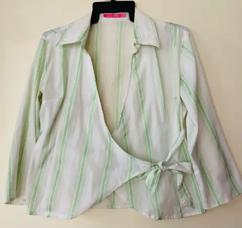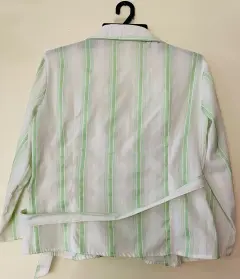 Bonita blusa cruzada, blanca con rayas verde limón, manga larga, se ajusta con lazo a la cintura. Da muy bonita forma. Hecha de poliéster, algodón y 13% spandex, por lo que estira un poco. Talla Grande. Ancho de hombros 40 cms., ancho axila 45 cms., largo 54 cms. Usada solo un par de veces. Está en perfecto estado.
