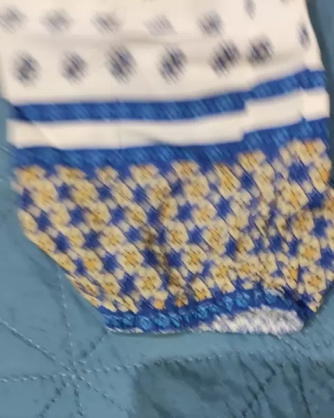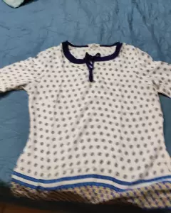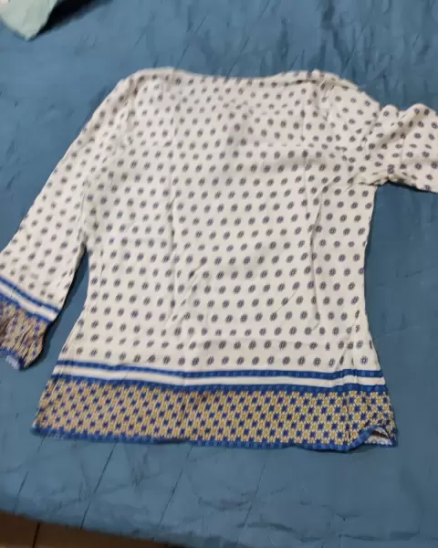 Blusa de manga con resorte tela fresca. Blusa tela fresca color blanca con florecitas azules el cuello azul ni las mangas con resorte y adorno azul tela delgada no sé transparentan cuello redondo tela fresca nueva en condiciones nueva se le cayó la etiqueta