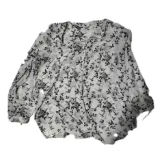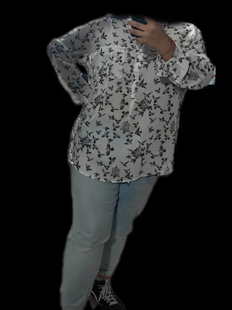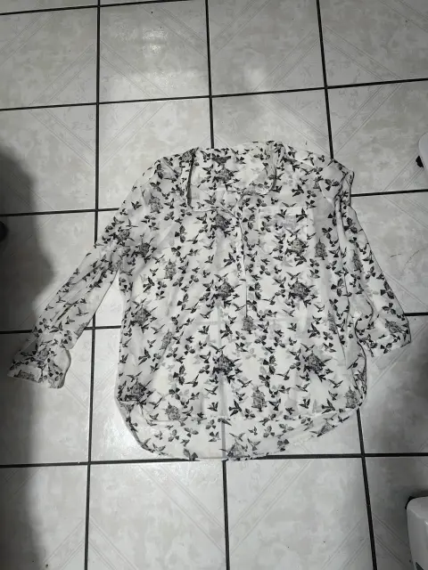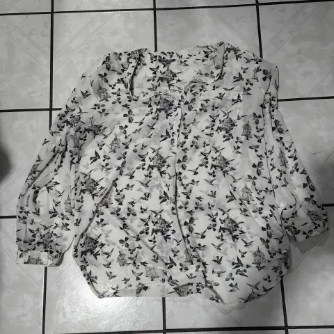 Blusa de vestir 3XL. Blusa blanca con diseño, es larga y de manga larga. Diseño de pajaros y jaulas