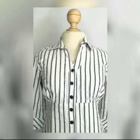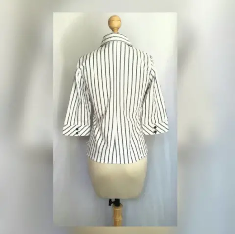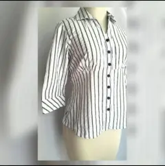 Blusa efecto Corrugado Rayas. Blusa tela corrugada con líneas gris acero y plateado, manga 3/4, cuello con solapa y cierre mediante botonadura. Talla 13 (REDUCIDA, DA MEJOR A 30/32). Dimensiones: 38 cms hombro a hombro, 47 cms axila a axila, 43 cms cintura, 55 cms zona baja, 40.5 cms largo manga. 95% algodón, 3% spandex, 2% lurex. Nunca se uso porque no me quedó. Para lavado en casa.