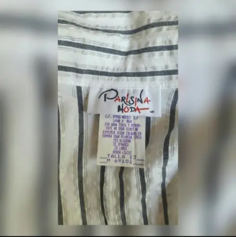 Blusa tela corrugada con líneas gris acero y plateado, manga 3/4, cuello con solapa y cierre mediante botonadura. Talla 13 (REDUCIDA, DA MEJOR A 30/32). Dimensiones: 38 cms hombro a hombro, 47 cms axila a axila, 43 cms cintura, 55 cms zona baja, 40.5 cms largo manga. 95% algodón, 3% spandex, 2% lurex. Nunca se uso porque no me quedó. Para lavado en casa.