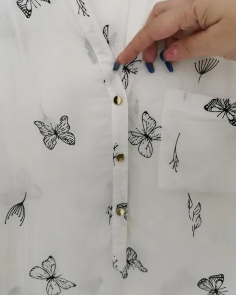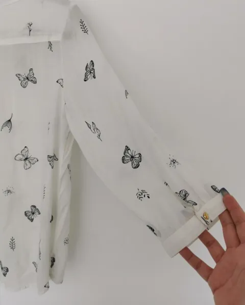 Blusa de tela tipo chifón, algo transparente. Color blanco con estampado de mariposas y hojas en color negro. Manga 3/4 con puño y boton. Tres botones al cuello. Los botones son dorados. Talla S.