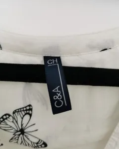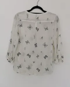 Blusa estampada C&A. Blusa de tela tipo chifón, algo transparente. Color blanco con estampado de mariposas y hojas en color negro. Manga 3/4 con puño y boton. Tres botones al cuello. Los botones son dorados. Talla S.