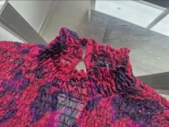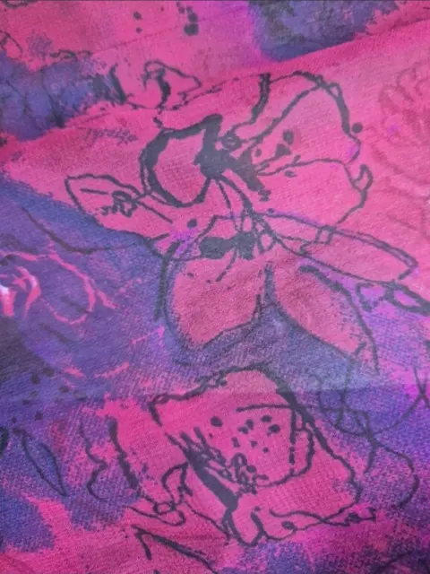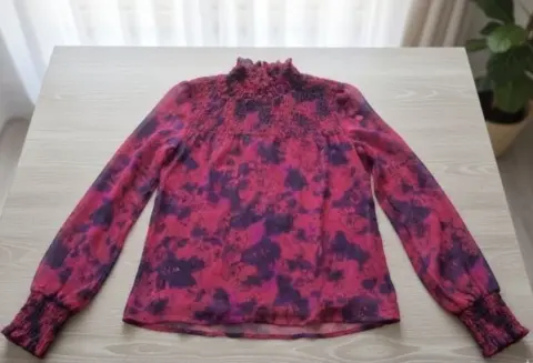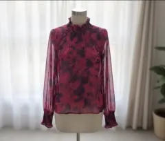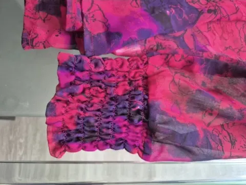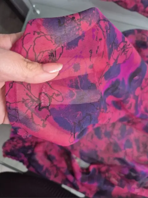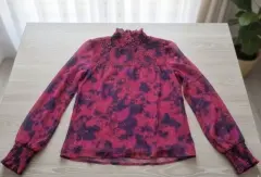 Blusa de manga larga con estampado en tonos fucsia y morado, tela ligera y semitransparente. Diseño con cuello y puños fruncidos que le dan un toque elegante y femenino. Ideal para outfits casuales o más formales, fácil de combinar. En excelentes condiciones, nunca se usó.
