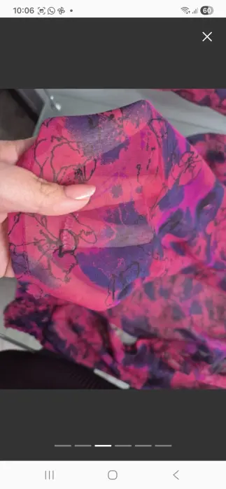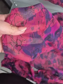 Blusa estampada transparente,manga larga. Blusa de manga larga con estampado en tonos fucsia y morado, tela ligera y semitransparente. Diseño con cuello y puños fruncidos que le dan un toque elegante y femenino. Ideal para outfits casuales o más formales, fácil de combinar. En excelentes condiciones, nunca se usó.