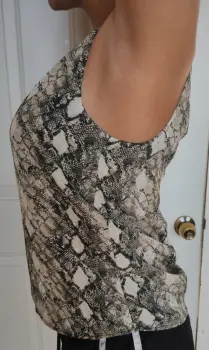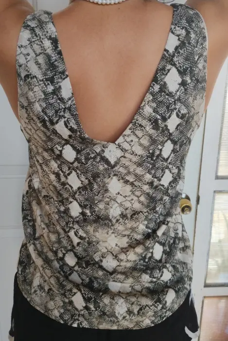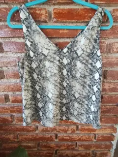 Blusa estampado serpiente xs. Blusa ligera con forro Sin manga y escote en espalda y frente en V Caída de tela espectacularAnimal print Tonos arena