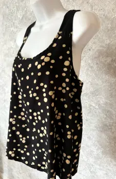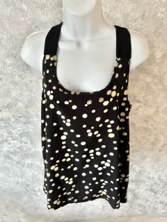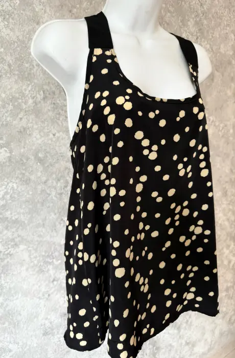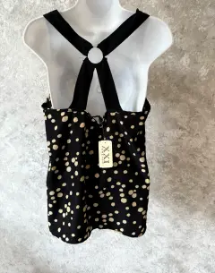 Blusa estilosa negra con lunares beige de Forever XXI Talla S, corte holgado y fresco, perfecto para días cálidos o para combinar con blazer en climas más frescos.Diseño de espalda cruzada con detalle de argolla al centro, que le da un toque original y moderno. Ideal para usar con jeans, pantalones de vestir o falda. Una prenda versátil que puedes llevar del día a la noche.