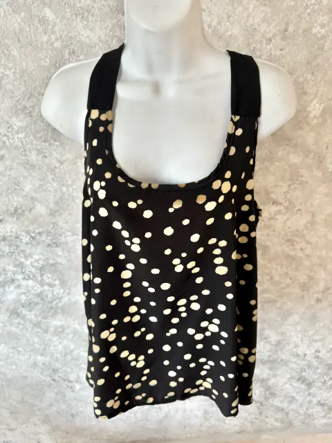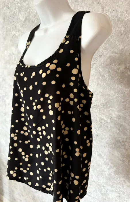 Blusa Forever XXI de lunares. Blusa estilosa negra con lunares beige de Forever XXI Talla S, corte holgado y fresco, perfecto para días cálidos o para combinar con blazer en climas más frescos.Diseño de espalda cruzada con detalle de argolla al centro, que le da un toque original y moderno. Ideal para usar con jeans, pantalones de vestir o falda. Una prenda versátil que puedes llevar del día a la noche.