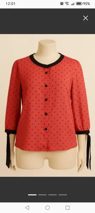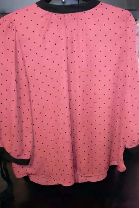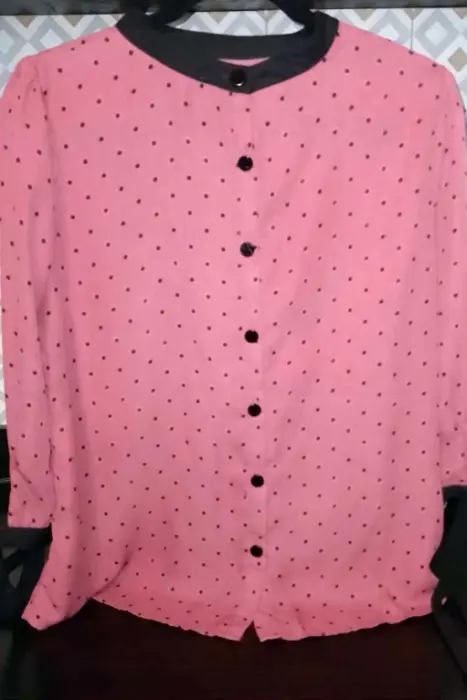 Blusa camisera sin cuello formal, rosa con punto negros, con listones en las mangas 3/4 y botones al frente. 104 cm pecho, 56 cm largo. Marca E-MTodas las compras incluyen obsequioAcepto ofertasEnvío a la brevedad