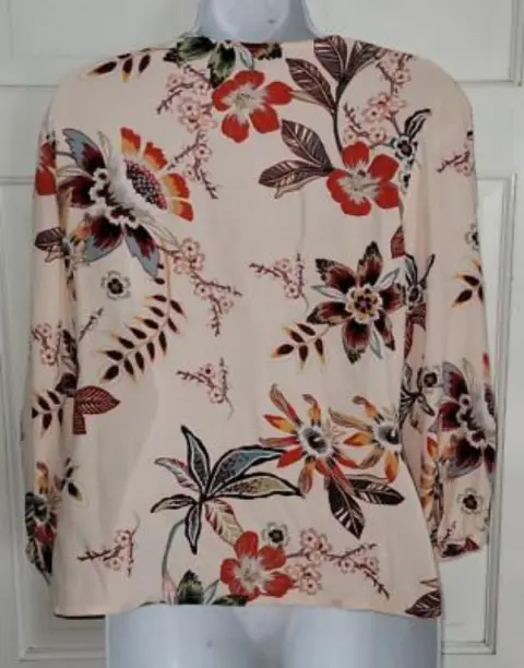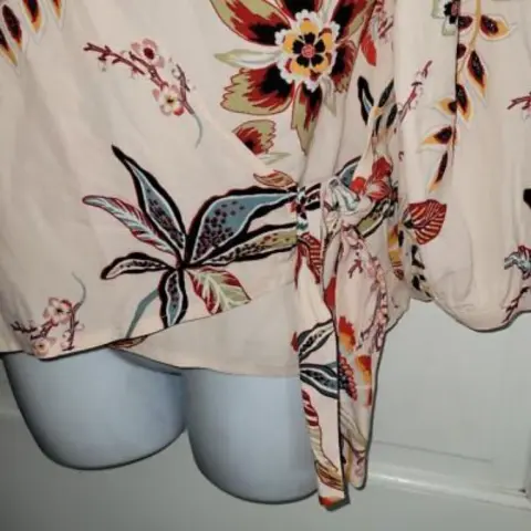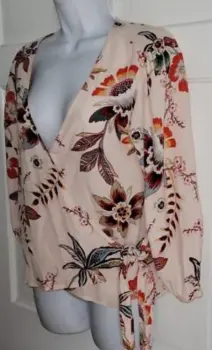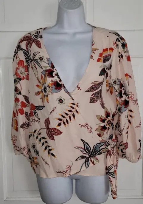La blusa de la imagen es una blusa cruzada (o wrap top) con un estampado floral. Estas tiene un escote en V y mangas tres cuartosEstoy abierta a recibir ofertas