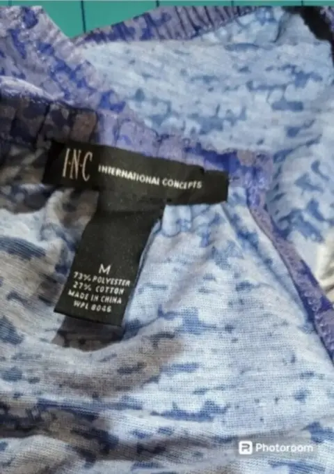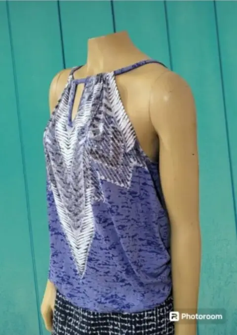 Blusa I.N.C. International Concepts. Blusa I.N.C. International Concepts, talla mediana, color azul con blanco y gris, acentos de piedritas plateadas en el pecho, cuello redondo alto, sin mangas, cintura elástica, boton de cierre en la espalda, hecha de mescla de poliéster y algodón, mide 28cm de hombro a hombro, 42cm de axila a axila, 45cm de cintura con 68cm de largo del hombro hacia abajo, previamente usada en buen estado.