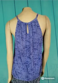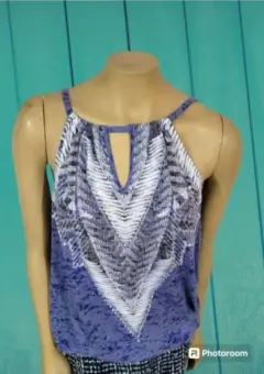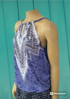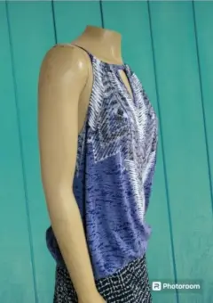 Blusa I.N.C. International Concepts, talla mediana, color azul con blanco y gris, acentos de piedritas plateadas en el pecho, cuello redondo alto, sin mangas, cintura elástica, boton de cierre en la espalda, hecha de mescla de poliéster y algodón, mide 28cm de hombro a hombro, 42cm de axila a axila, 45cm de cintura con 68cm de largo del hombro hacia abajo, previamente usada en buen estado.