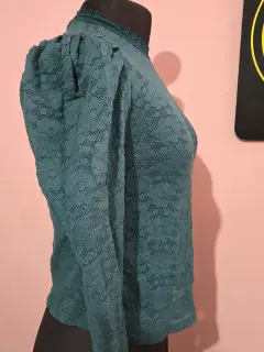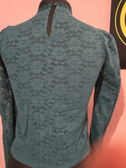 Blusa ligera de encaje stradivarius. Blusa stradivarius color verde botella oscuro, manga larga, la tela es transparente pero no es fría no estira queda máximo a talla 30mx