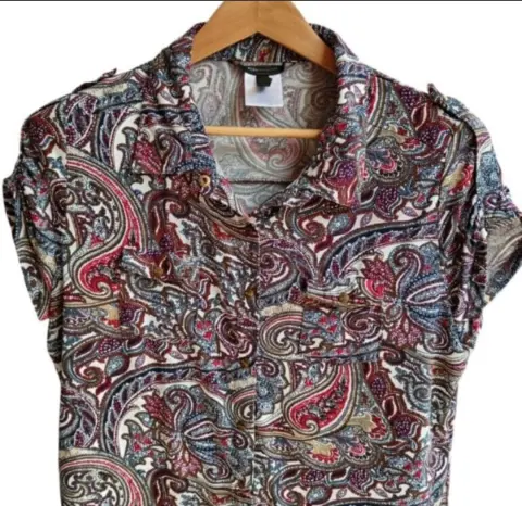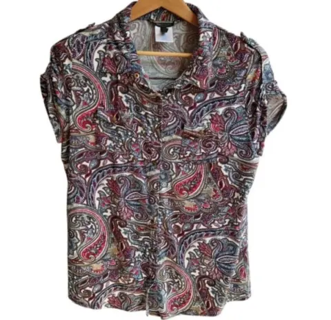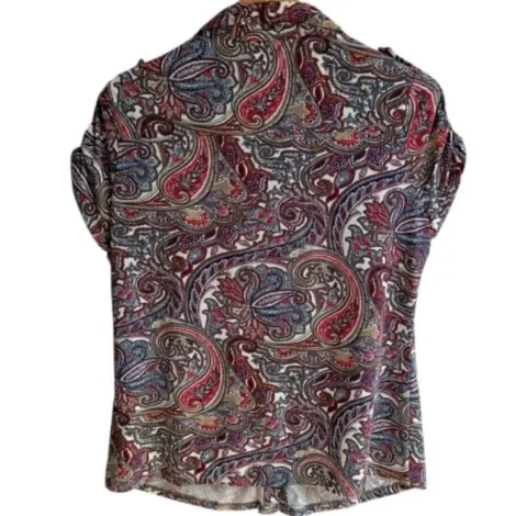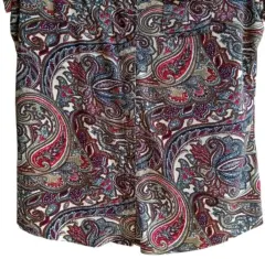 Blusa manga corta BCBGMAXAZRIA Talla L Hecho de material elástico, con diseño paisley, cierre con botones a presión con botones grabados. Medidas tomadas por un solo lado: *Hombros 41 cm *Axila-Axila 54 cm *Largo 66 cm ⚜️ Por favor si vas a ofertar que sea solo porque tú compra será segura ⚜️