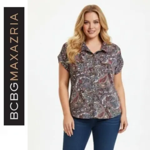 Blusa manga corta BCBGMAXAZRIA. Blusa manga corta BCBGMAXAZRIA Talla L Hecho de material elástico, con diseño paisley, cierre con botones a presión con botones grabados. Medidas tomadas por un solo lado: *Hombros 41 cm *Axila-Axila 54 cm *Largo 66 cm ⚜️ Por favor si vas a ofertar que sea solo porque tú compra será segura ⚜️