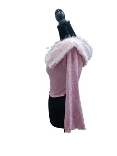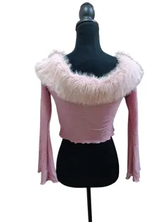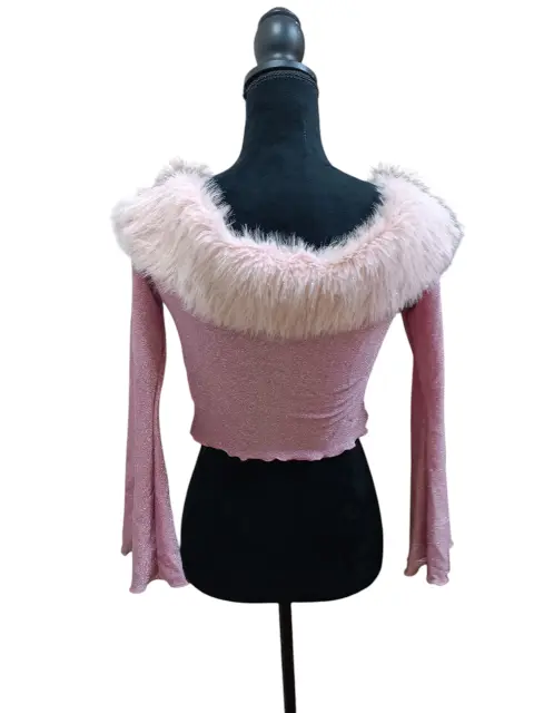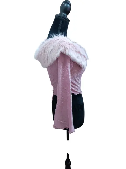 BLUSA CROP TOP SHEIN ICON, TALLA M, COLOR ROSA, CON GLITTER PLATA, PELUCHE AL REDEDOR DEL CUELLO, MIDE DE HOMBRO A HOMBRO 40 CM DE AXILA A AXILA 43.5 CM, DE LARGO 38 CM, ESCOTE EN EL PECHO,MANGA ACAMPANADA, SIMILAR ÚLTIMA FOTO.