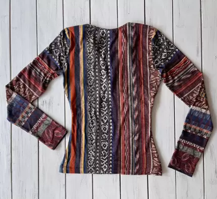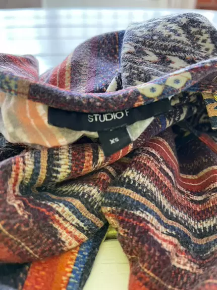 Blusa multicolor Studio F. Talla: XS fiel a la talla.Blusa manga larga, ajustada al cuerpo, al frente en el escote trae jareta entre tejida, se le cortaron las etiquetas interiores porque picaban al usarse.Los colores en la foto se ven más brillantes.