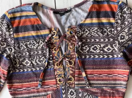 Talla: XS fiel a la talla.Blusa manga larga, ajustada al cuerpo, al frente en el escote trae jareta entre tejida, se le cortaron las etiquetas interiores porque picaban al usarse.Los colores en la foto se ven más brillantes.