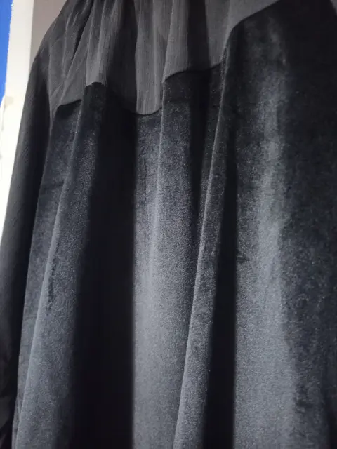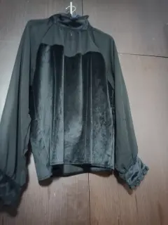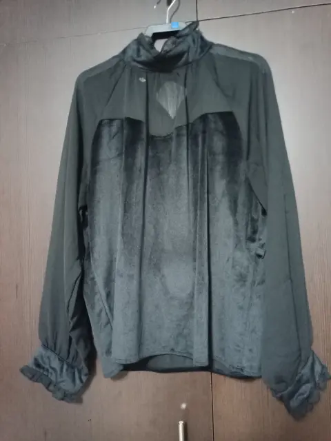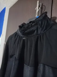 Blusa negra elegante, con olanes en cuello y puños, terciopelo en pecho.Medidas:Pecho: 115 cmCintura: 100 cmLargo: 62 cm
