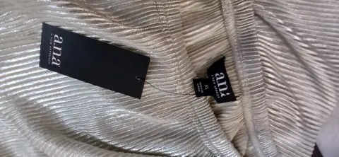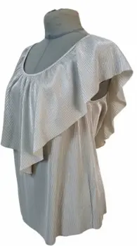 Una blusa perfecta para lucir espectacular en tu próxima ocasión especial! Este top de la marca a.n.a. "a new approach" es de un elegante tono dorado pálido o champagne. Su diseño de hombros descubiertos con un gran volante la hace muy femenina y estilizada.La tela tiene un hermoso efecto plisado y un acabado metálico que la hace ideal para brillar. Puedes combinarla con pantalones de vestir, una falda lápiz o incluso jeans para un look casual-chic. Está completamente nueva y con sus etiquetas puestas. Talla XL