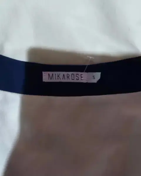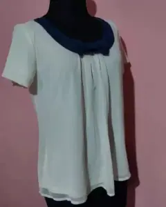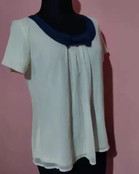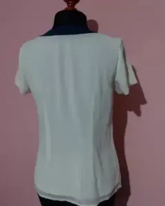 Blusa color hueso, parte de arriba tipo seda con fondo de licra y algodón, muy cómoda, el bies en el cuello es azul marino y tiene un pequeño moño, no se transparenta