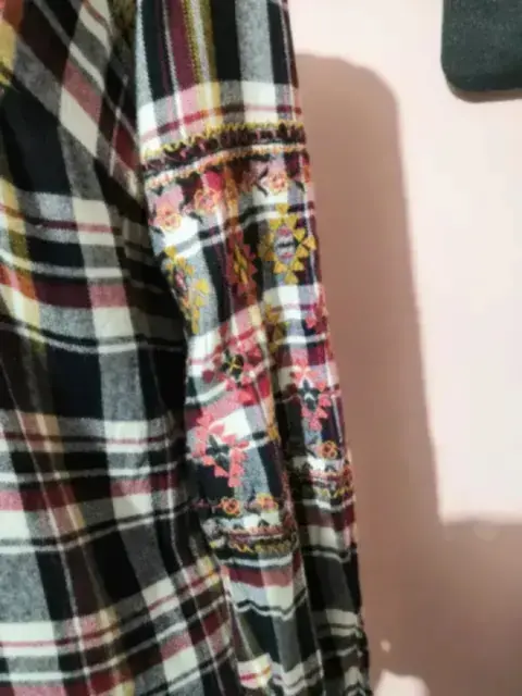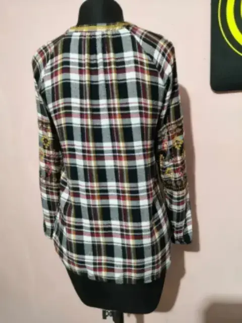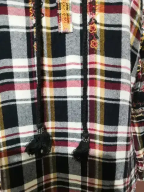 Blusa tipo bordada de franela. Blusa tipo franela abrigadora en tonos rojo, negro y amarillo, bordado en flores amarillas, con cordones al frente una puesta sin detalles