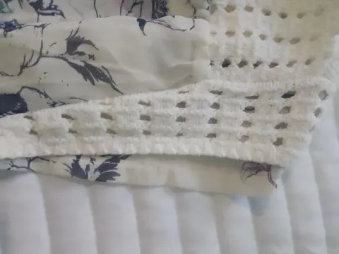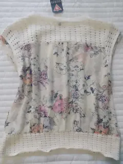 Blusa blanca transparente con estampado de flores, hombros y parte baja es como tejido,